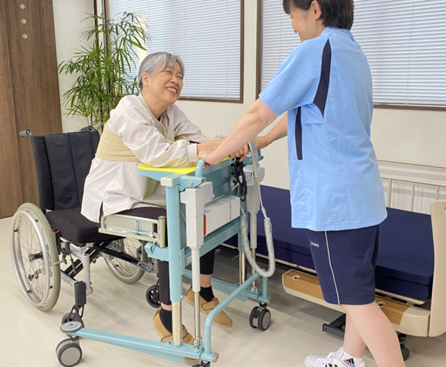 要介護者は座位姿勢のままで、ベッドから車いすなどへ介護者の操作により安全に移乗介助を受けることが出来ます。耐荷重100kg